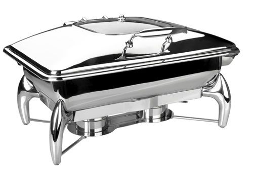 Elégant Chaffin dish en inox. Couvercle à vérin qui tient ouvert et se ferme sans bruit. Hublot en verre securit. Equipé avec un bac Gastrinox H.6,5cm. Fonctionne avec du gel feu vendu séparément. Un support induction peut s'adapter sur ce modèle.